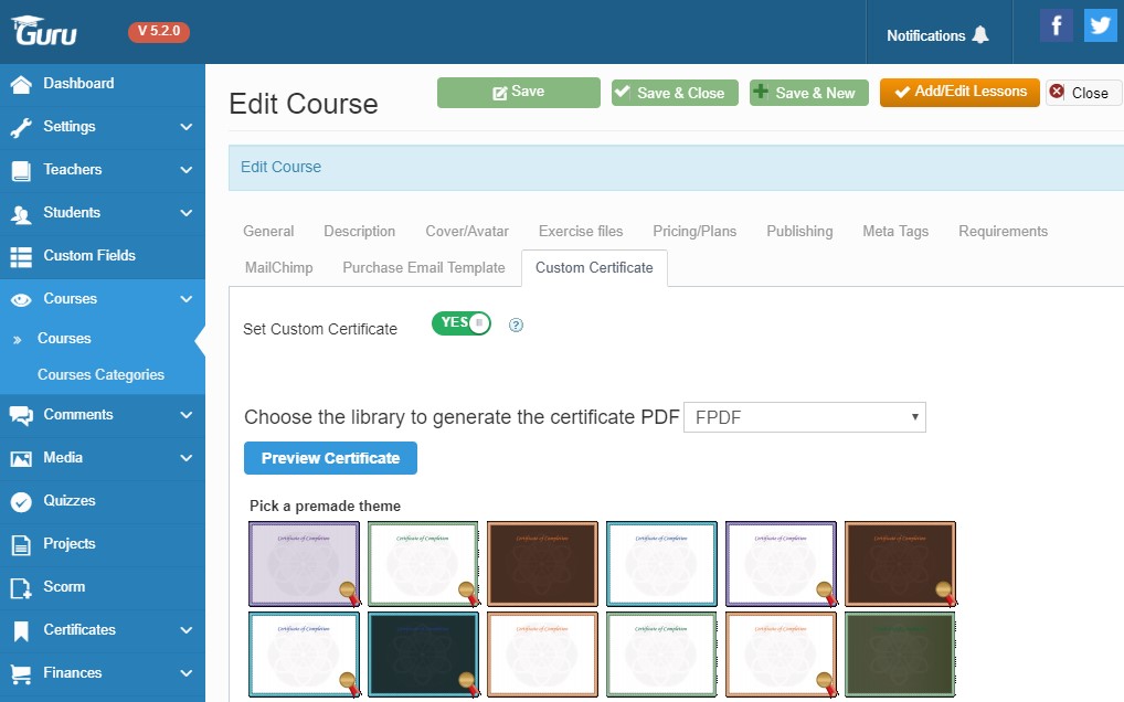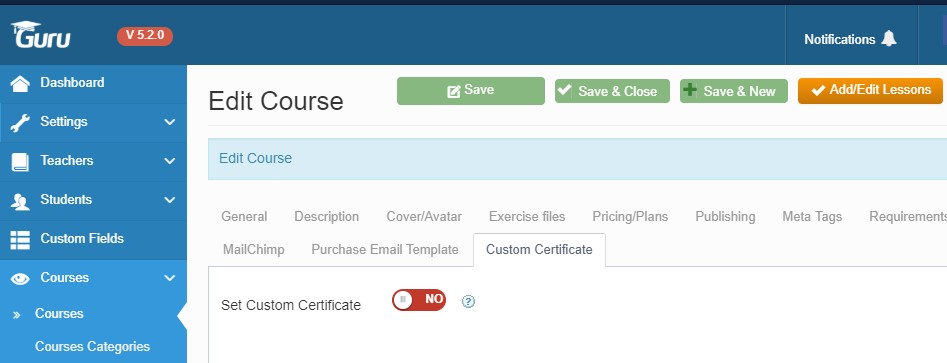Before the release of Guru 5.2.0 certificates will be issued a standard for all the course, To configure the default certificates you set the view option in Guru > Certificates. This release will give you more control over the certificates. Now you can set a different certificate for each different course, Yes! In each course option, you will see a new option.
